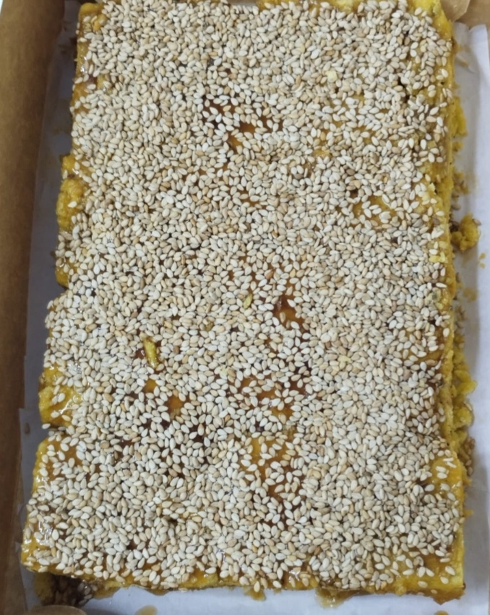 Turrón clásico y turrón de ajonjolí: con almíbar casero afrutado.